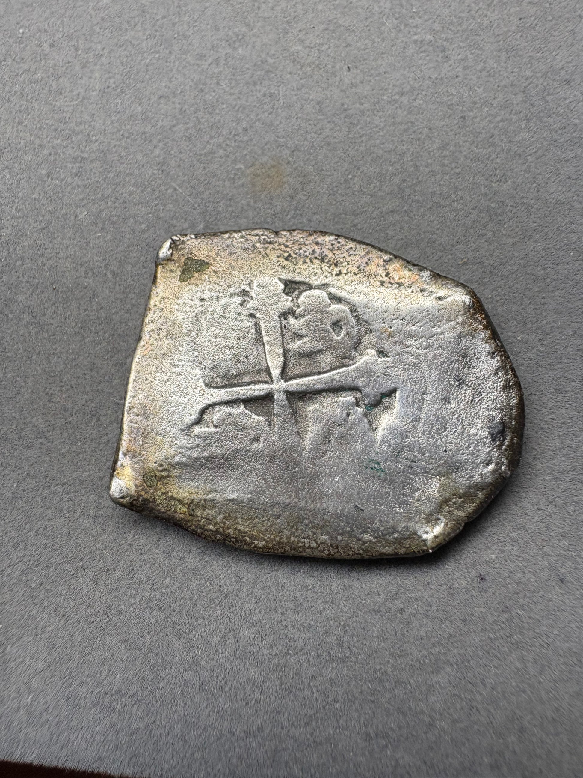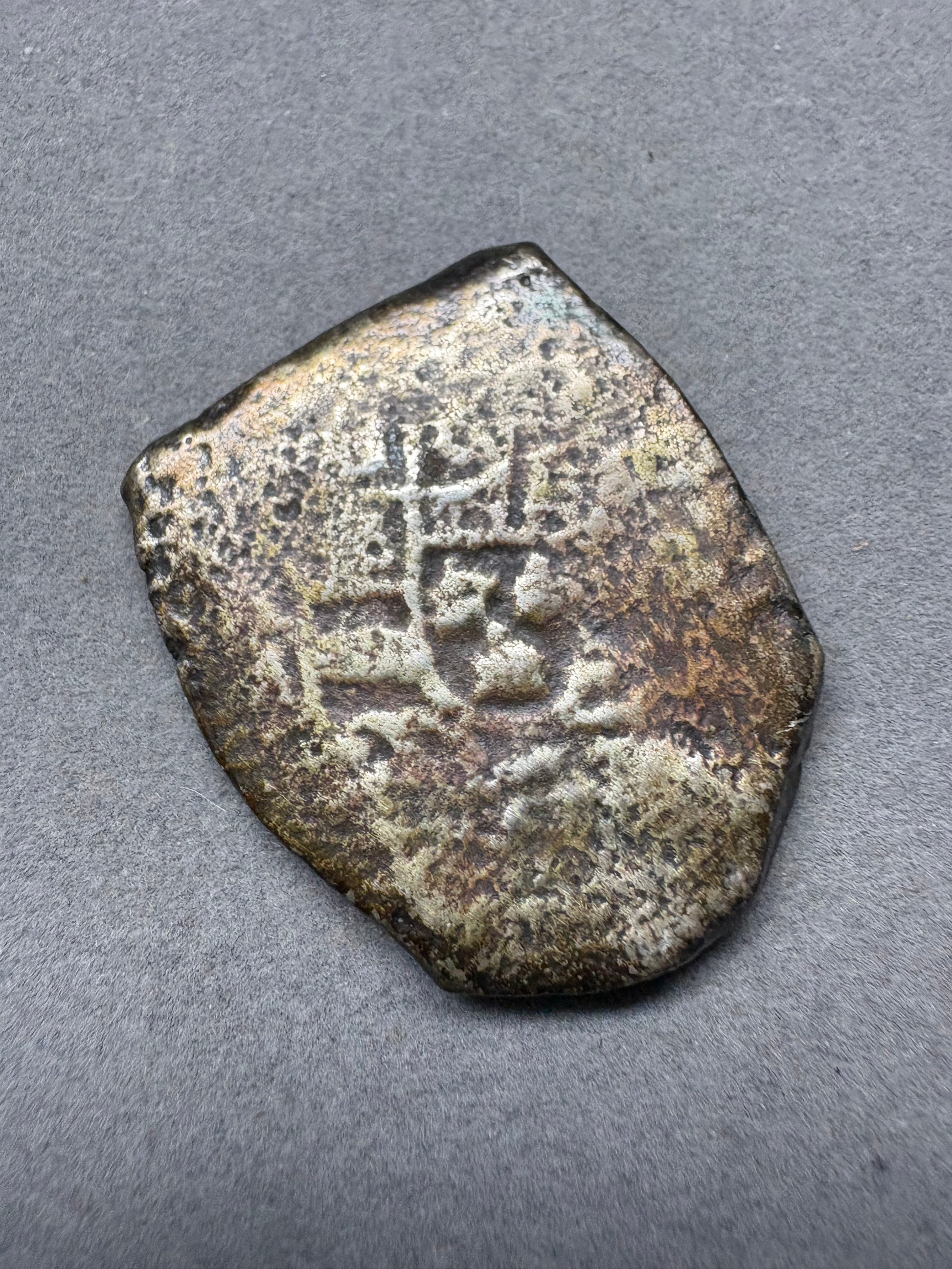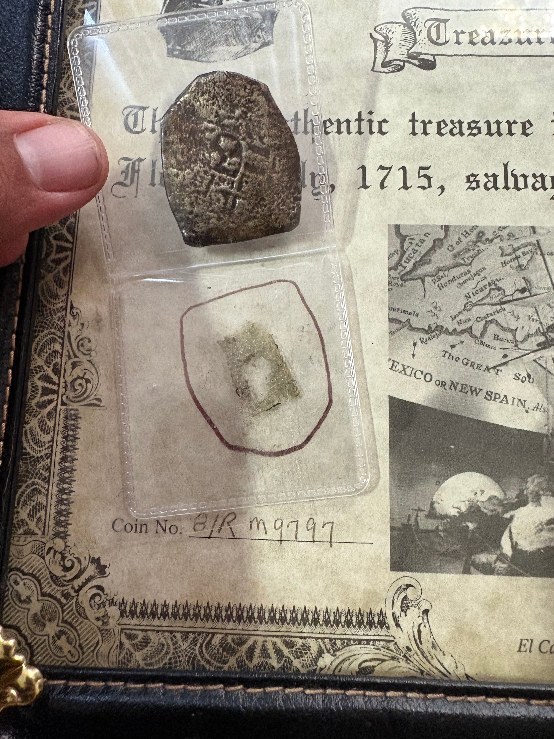 This authentic 1715 Fleet 8 Reales represents a piece of maritime history from the Spanish colonial era. Minted in Mexico City under Philip V's reign with assayer J, this silver coin weighs 23.2 grams and comes mounted in an elegant standup frame for display. Accompanied by a certificate of authenticity signed by Ella M. from Real Eight Co, this numismatic treasure captures the legacy of the legendary 1715 Spanish treasure fleet. Perfect for collectors of colonial coins, shipwreck artifacts, and historical Spanish currency.