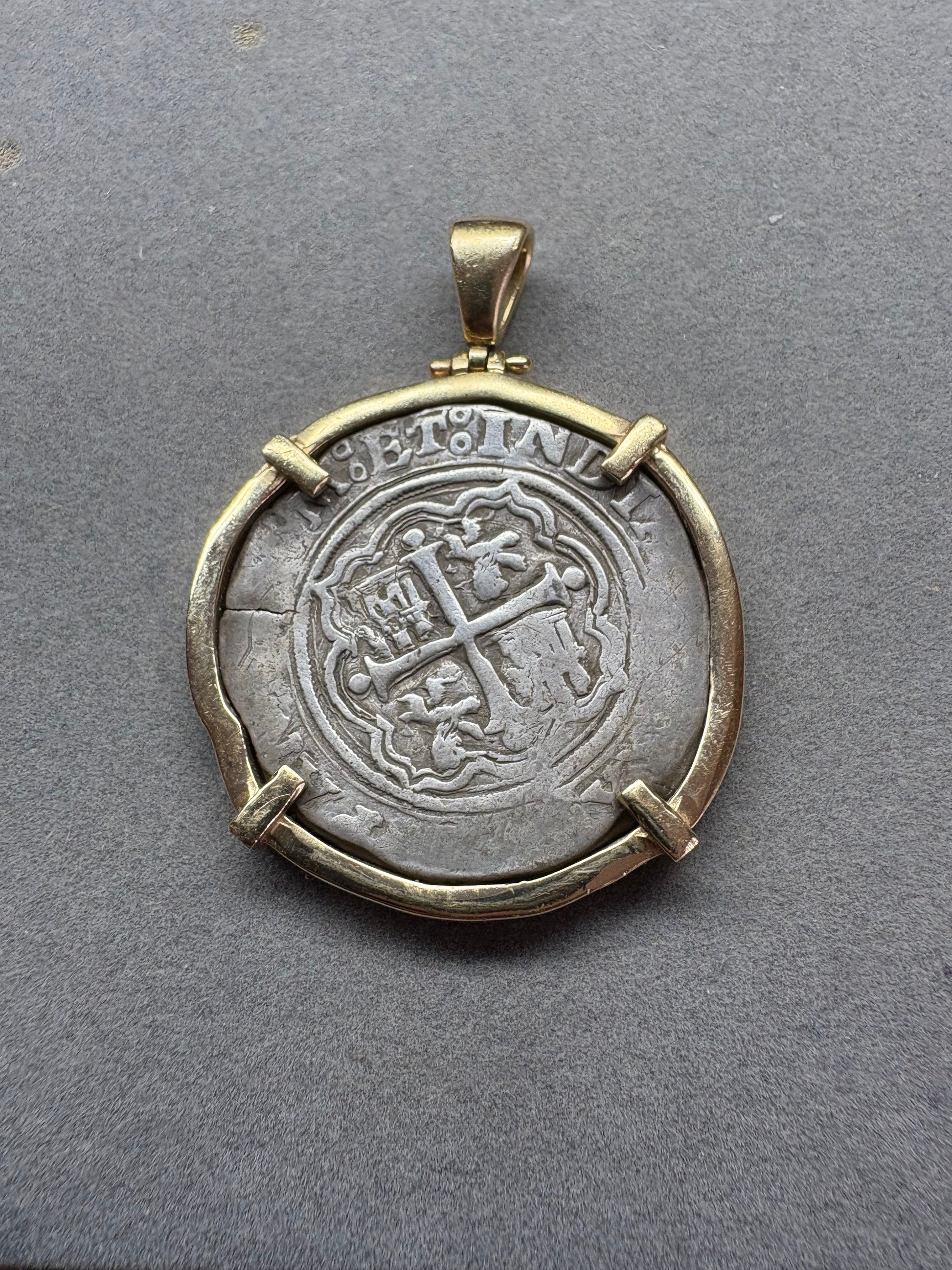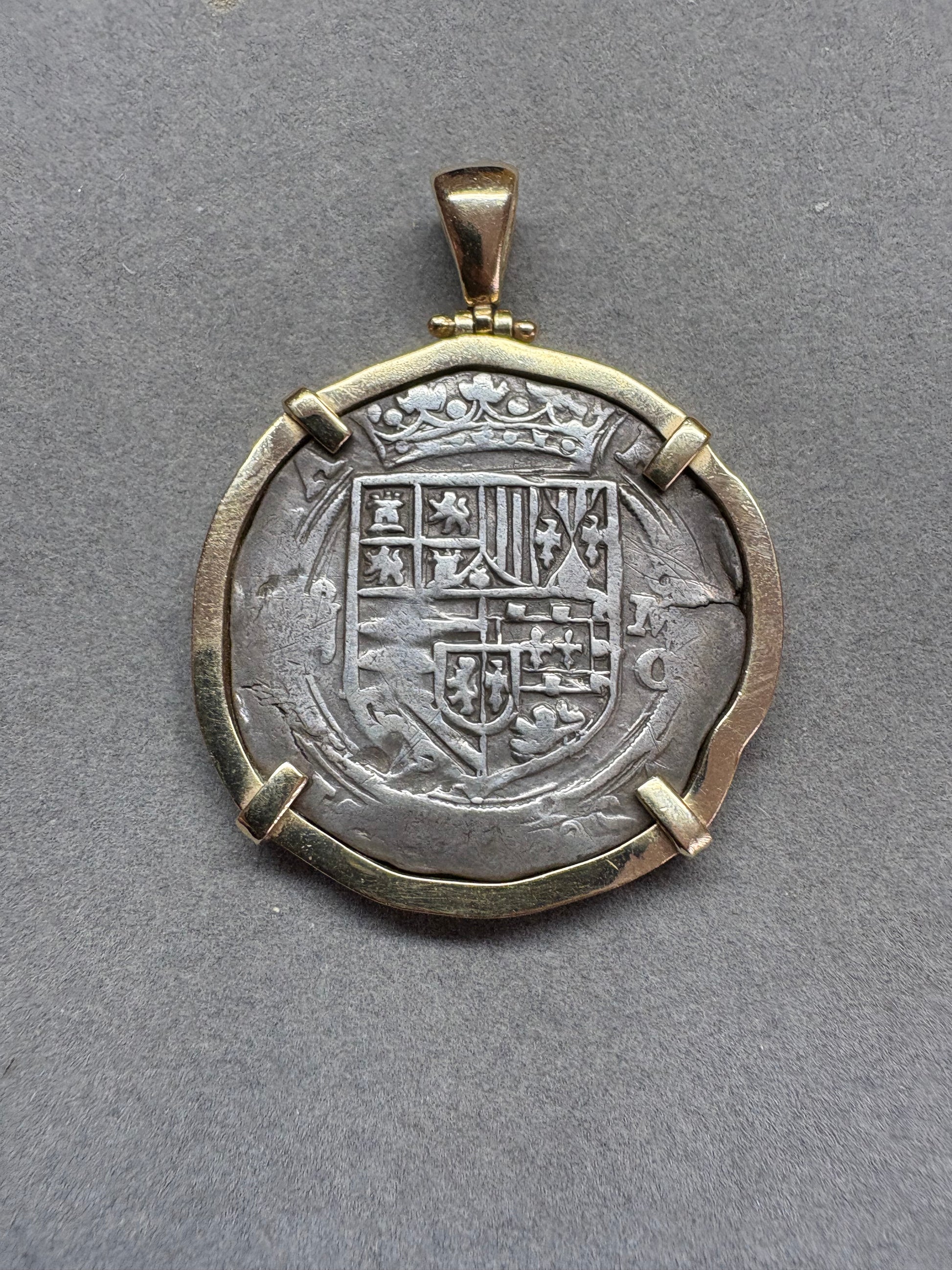 Atocha Shipwreck 4 Reale, Rare Mexico City Mint and O Assayer, 13.5 grams, Solid 14kt Gold Mounting,Napkin Deal Coin! CH9-41-1130