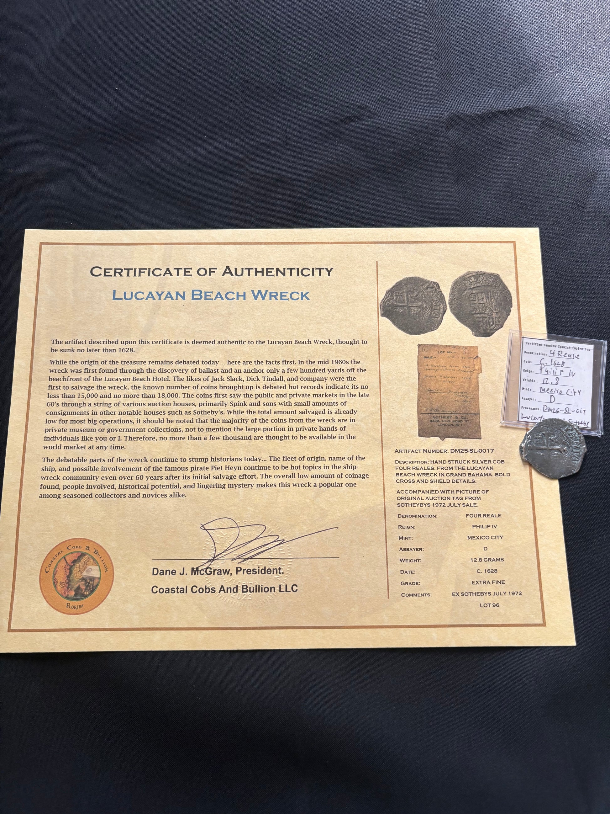A rare colonial Spanish silver coin from the prestigious Mexico City Mint, this 4 Reales piece features the "D" assayer mark and weighs 12.8 grams. Recovered from the Lucayan Beach shipwreck, this historically significant numismatic specimen carries documented provenance from a notable 1972 Sotheby's auction. An exceptional addition for serious collectors of Spanish colonial coinage and maritime artifacts, offering both historical authenticity and investment-grade rarity.